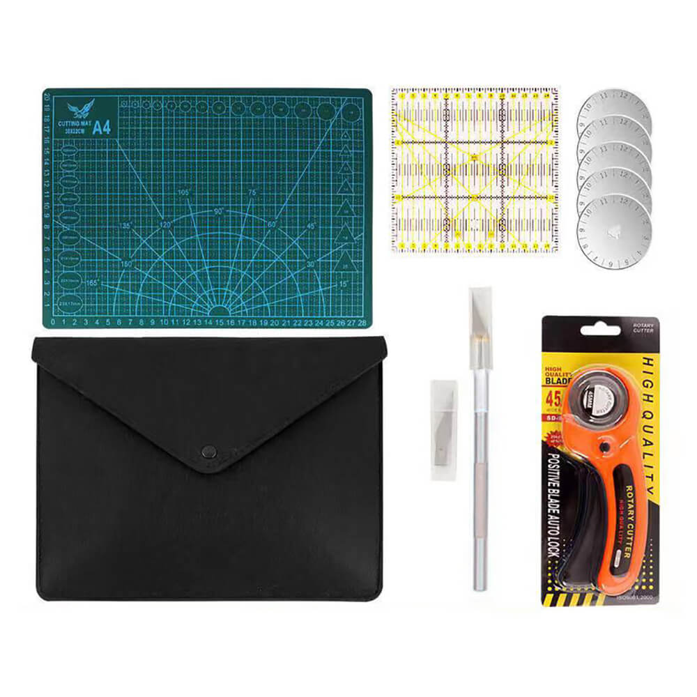 Набор для кройки, шитья Creative Mix содержит все необходимые инструменты для раскройки тканей. Это полезный портновский набор, в состав которого входят раскроечный коврик для нарезания, дисковый нож со сменными лезвиями, канцелярский скальпель, линейка. Набор портного укладывается в сумку для хранения, в которой удобно перевозить инструменты. Нож для рукоделия из ткани и кожи нарезает на тонкие полосы без образования кромки. Лезвие способно одновременно разрезать до 6 тонких слоев материалов. Также набор для кройки и шитья можно использовать для нарезания бумаги, брезента, обивки, винила и других материалов.